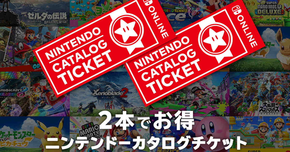 『ニンテンドーカタログチケット』というのは任天堂のオンラインサービス加入者限定で使えるサービスであり、9,980円(税込)のチケットを購入すると、対象のソフト(ダウンロード版)2つと交換ができるもの。